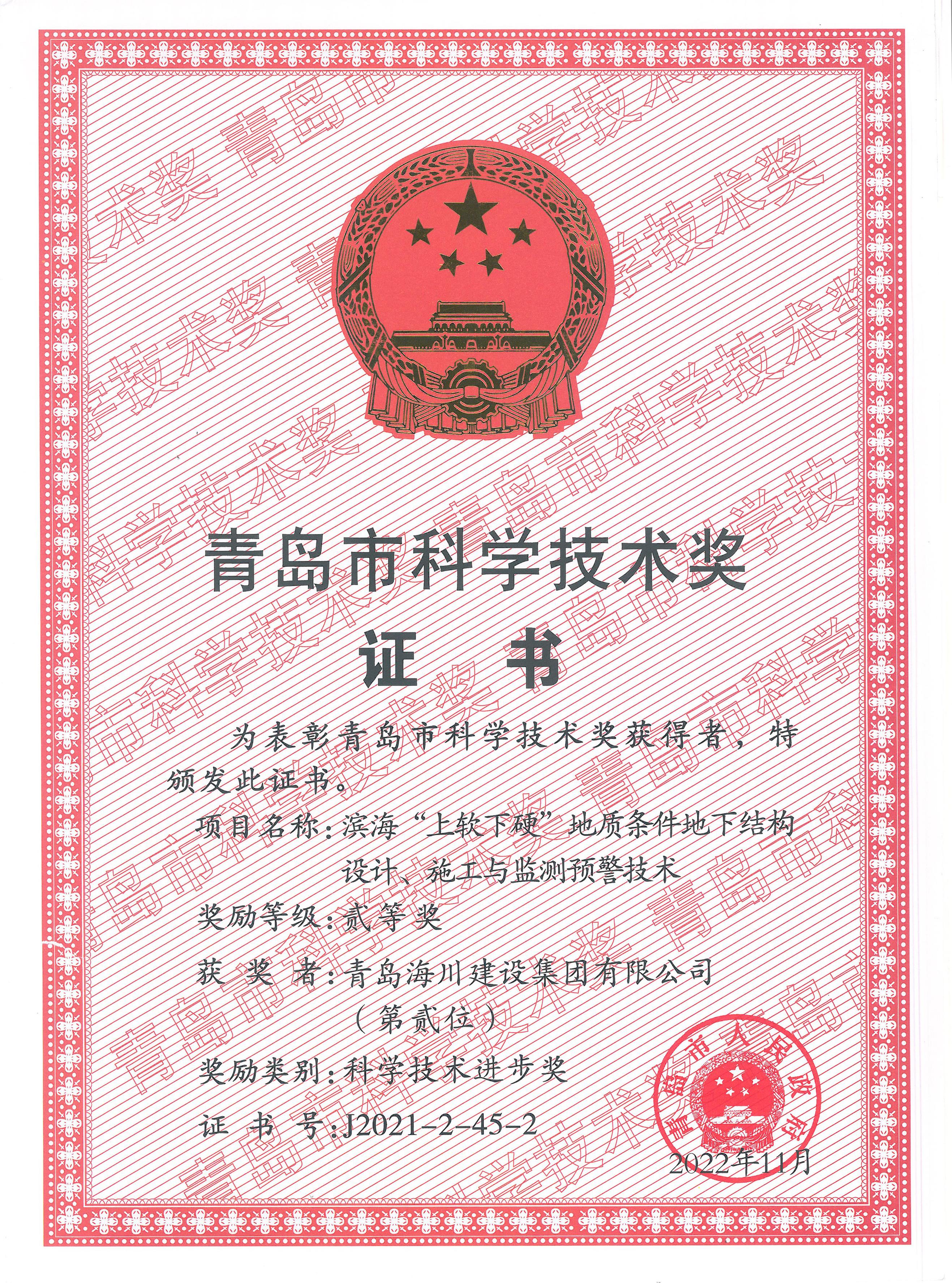 海川集團(tuán)榮獲青島市科學(xué)技術(shù)獎(jiǎng)2023-03-06近日,集團(tuán)公司領(lǐng)回了“青島市科學(xué)技術(shù)獎(jiǎng)”榮譽(yù)證書。經(jīng)青島市市科學(xué)技術(shù)獎(jiǎng)勵(lì)評(píng)審委員會(huì)評(píng)審、青島市市科學(xué)技術(shù)獎(jiǎng)勵(lì)委員會(huì)核定,市政府決定,由青島理工大學(xué)與青島海川建設(shè)集團(tuán)有限公司聯(lián)合申報(bào)的《濱?!吧宪浵掠病钡刭|(zhì)條件地下結(jié)構(gòu)設(shè)計(jì)、施工與監(jiān)測預(yù)警技術(shù)》獲得科學(xué)技術(shù)進(jìn)步獎(jiǎng)二等獎(jiǎng)。課... -
