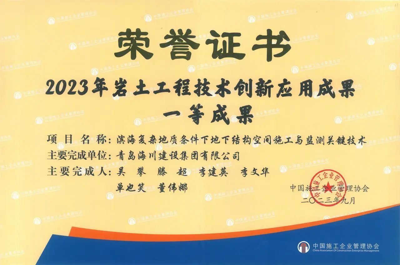 創(chuàng)新賦能 科技爭先 | 青島海川建設(shè)集團(tuán)榮獲多項(xiàng)科技成果獎(jiǎng)勵(lì)2023-10-08近日,中國施工企業(yè)管理協(xié)會(huì)公布了2023年度巖土工程技術(shù)創(chuàng)新應(yīng)用成果的通知,青島海川建設(shè)集團(tuán)研究課題《濱海復(fù)雜地質(zhì)條件下地下結(jié)構(gòu)空間施工與監(jiān)測關(guān)鍵技術(shù)》榮獲一等成果,該成果為集團(tuán)公司首次獲此殊榮,也是本年度青島市唯一一等獎(jiǎng)獲獎(jiǎng)獎(jiǎng)項(xiàng)。近年來,海川建設(shè)始終堅(jiān)持以科技為本,以... -